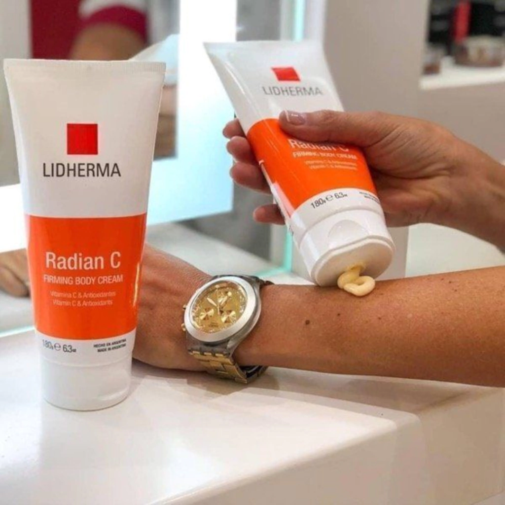 Radian C Body Cream es una crema corporal diseñada para mejorar la firmeza de la piel gracias a su textura ideal y a sus activos que estimulan la formación de colágeno. Además, ayuda a atenuar manchas al disminuir la producción de melanina, y sus antioxidantes colaboran en la inhibición de radicales libres.